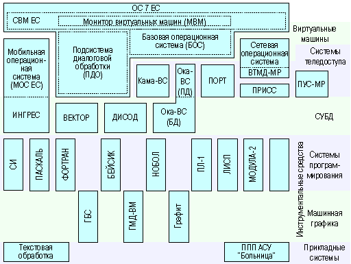 Zum ОС 7 ЕС gehören zwei Bestandteile : das System virtueller Maschinen (SVM ЕС Entwickler NIEWM) und das „Basis Operationssystem“ (BOS)Anmerkung . Das SVM sichert die Funktionsbasis für das OC 7 EC mittels der Realisierung einer virtuellen Maschine. Mittels von virtuellen Maschinen werden alle Arbeitsmodi und Subsysteme des OC 7 EC realisiert . SVM realisiert mittels des Dialog- Subsystems PDO den Dialogbetrieb. Alle Subsysteme des SVM können im Rahmen des OC 7EC genutzt werden. Das BOS БОС ist bestimmt für die Schaffung eines Betriebssystems und die Ausführung der Hauptfunktionen des OC EC. Es ist auf den Paketverarbeitungsbetrieb orientiert und kann nur in einer Umgebung einer virtuellen Maschinen genutzt werden. Dabei wird die Aufwärtskompatibilität mit dem OC EC 6.1. auf Anwenderprogrammniveau erhalten. BOS dient als Basis für das Funktionieren der typischen Anwenderpakete. BOS kann auf einer oder mehreren virtuellen Maschinen im Basis- Steuermodus arbeiten. Die Orientierung von BOS auf ein Funktionieren ausschließlich im Umfeld virtueller Maschinen des SVM bestimmt eine Reihe von seinen Besonderheiten in Bezug auf die Modi des Steuerprogrammes (MFT, MVT, SVS) des ОС ЕС 6.1: